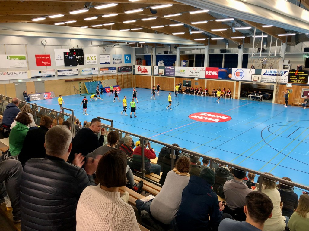 Aber bevor es mich an diesem milden Wochenendtag gen Kieler Norden verschlägt, verlasse ich unsere Landeshauptstadt zunächst nach Süden. Denn das dritte Sportevent habe ich heute persönlich zu bieten: Eine kleine Tour de Kieler Umland auf dem Gravel Bike. An der Eider entlang geht es nach Mielkendorf, von dort aus gen Schönwohld und durchs Fegefeuer nach Quarnbek. Mit der Landwehr-Fähre überquere ich den Kanal, bevor mich mein Weg dann mit dem Blick auf einen wunderschönen Sonnenuntergang über Schinkel, Warleberg, Neu- und Altwittenbek zum Gut Knoop und von dort aus nach Altenholz führt, so dass ich nach knapp 40 Kilometern ca. fünf Minuten vor der geplanten Anwurfzeit die Stifter Sporthalle erreiche. Die Halle ist bei diesem Mittelfeldduell mit ca. 400 Zuschauern angemessen gefüllt. Aus einer kleinen Supportecke werden die Altenholzer Wölfe aktiv mit Gesängen unterstützt, ansonsten treffe ich das übliche Handball-Klatschpublikum an. Der Hallensprecher senkt mit Verkündung der Teamaufstellungen die Erwartungen. Diverse junge Talente mit Zweitspielrecht seien heute nicht dabei, da sie den großen Nachbarn und Kooperationspartner THW Kiel bei der A-Jugend-Meisterschaft unterstützen würden. Im Ergebnis stünde heute nur ein Wechselspieler zur Verfügung. Auch der etatmäßige Trainer sei bei diesem Event unabkömmlich, so dass heute Ersatztrainer, u.a. die THW-Legende Pitti Petersen die Altenholzer Mannschaft coachen würden. Entsprechend unsortiert wirkt der Start. Die Gäste aus Hannover, die keine Anhänger mitgebracht haben, ziehen recht rasch mit sechs Toren davon, bevor dann jedoch die Heimmannschaft den Turnaround schafft. Mit dem Halbzeitpfiff gelingt der Ausgleich zum 16:16.