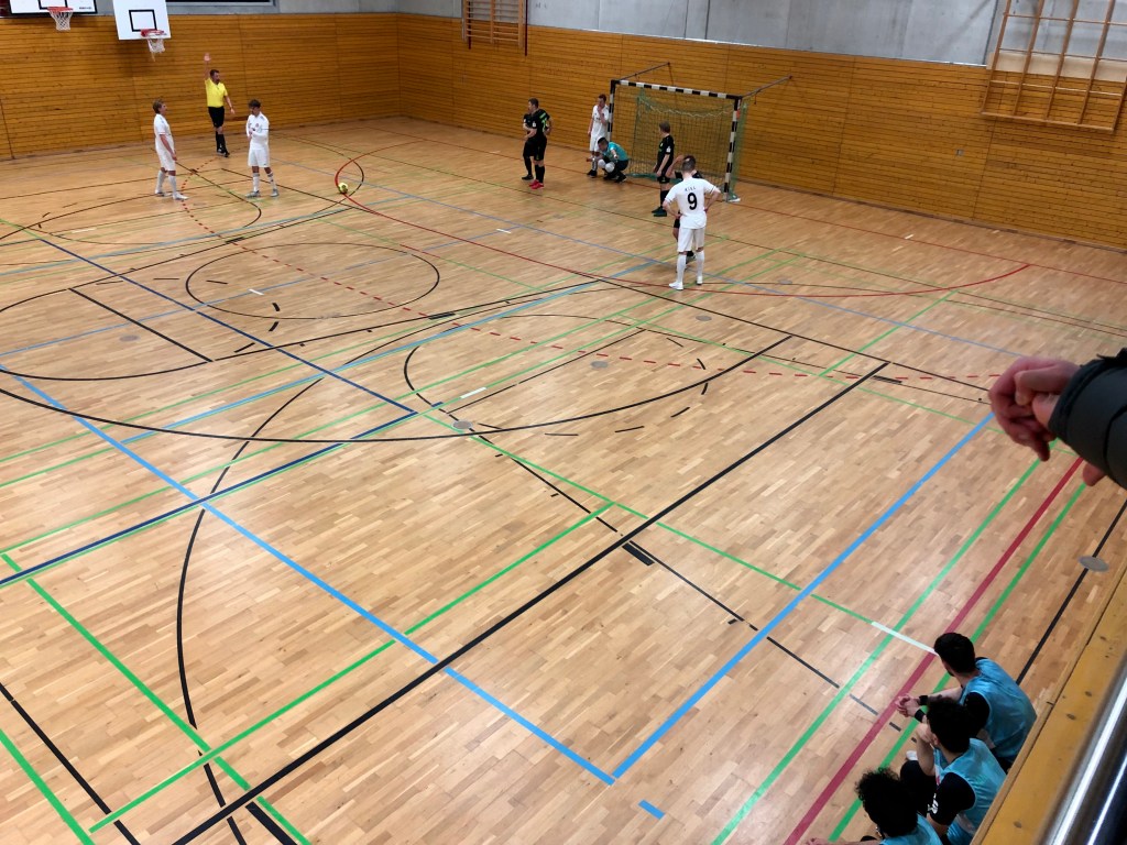 Doch zum Spiel: Futsal ist tatsächlich eine komplett eigene Sportart. Das hier heute hat nichts zu tun mit den zum Teil unterirdisch-uninspirierten Futsal-Versuchen gemeiner B-Klassen-Fußballer bei den regulären Kieler Hallenkreismeisterschaften vor zwei Wochen, denen ich zwischen Samstags-Einkäufen eine knappe Stunde Aufmerksamkeit schenkte und die hier keine weitere Erwähnung finden sollen. An diesem Tag in Friedrichsort läuft der Ball deutlich flüssiger. Alle Akteure haben verinnerlicht, was beim Futsal Erfolg verspricht. Die Pässe sind überwiegend genau, scharf und vor allem flach. Hier und da sind eingespielte Spielzüge zu bestaunen, wildes Gebolze hingegen kaum. Die Gäste laufen in den Trikots ihrer eigenen Fußball-Mannschaft auf und haben zwei, drei feine Kicker in ihren Reihen, die Kieler funktionieren insbesondere im Zusammenspiel. Die 2:0-Pausenführung resultiert aus zwei wunderbaren Spielzügen. Nach dem Wiederanpfiff erhöht der PTSK auf 3:0, so dass das Spiel entschieden scheint. Die 96er halten jetzt aber gut dagegen, können verkürzen, so dass es zum Ende hin noch eine Zitterpartie wird, die erst mit einem Tor in der letzten Minute entschieden wird. Kiel bleibt also im Aufstiegsrennen!