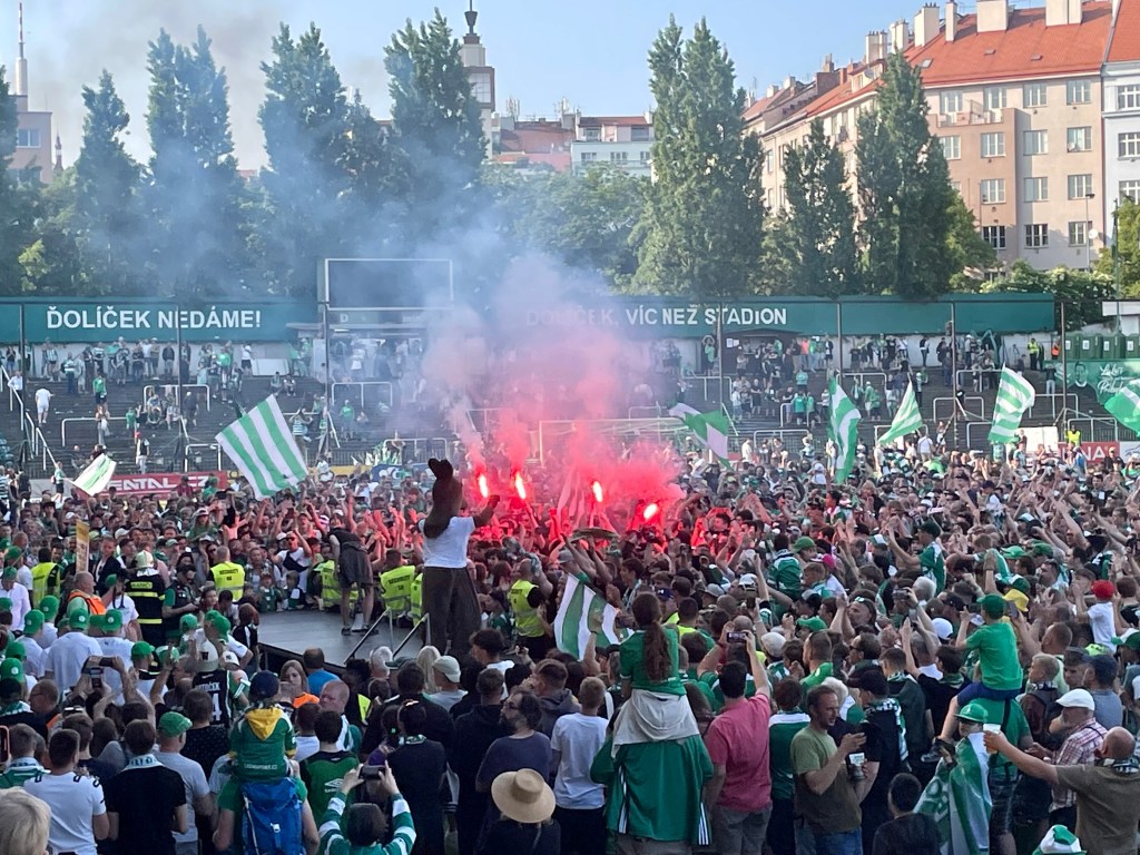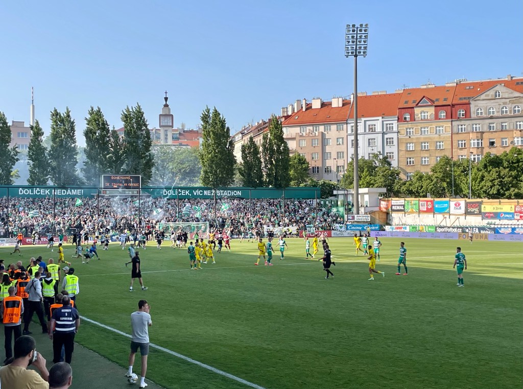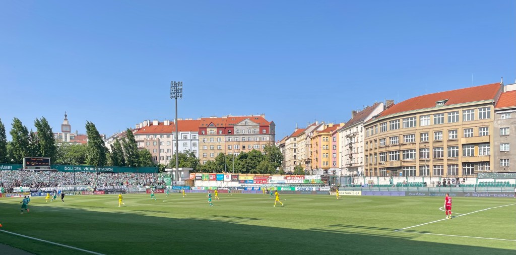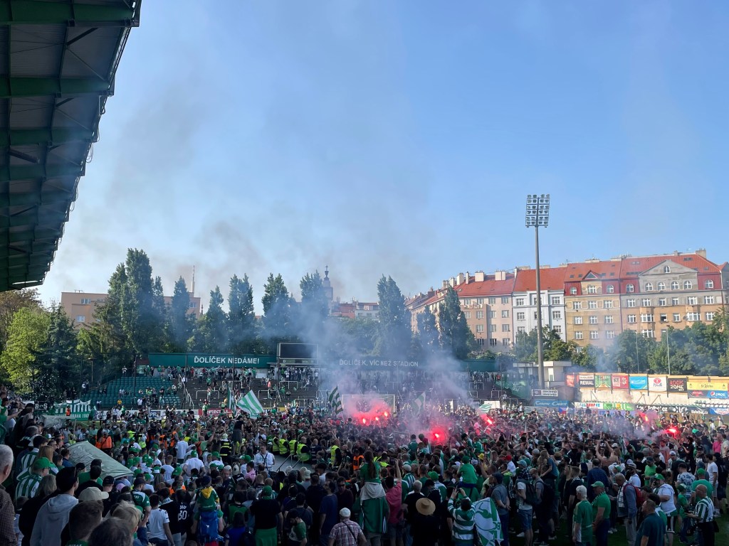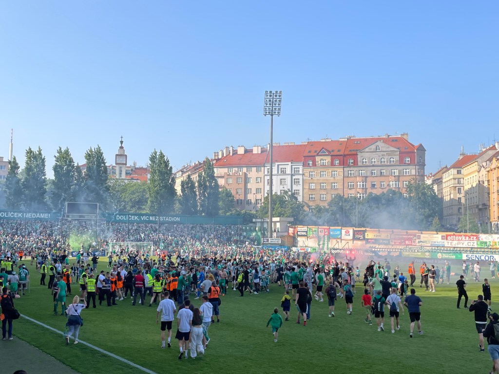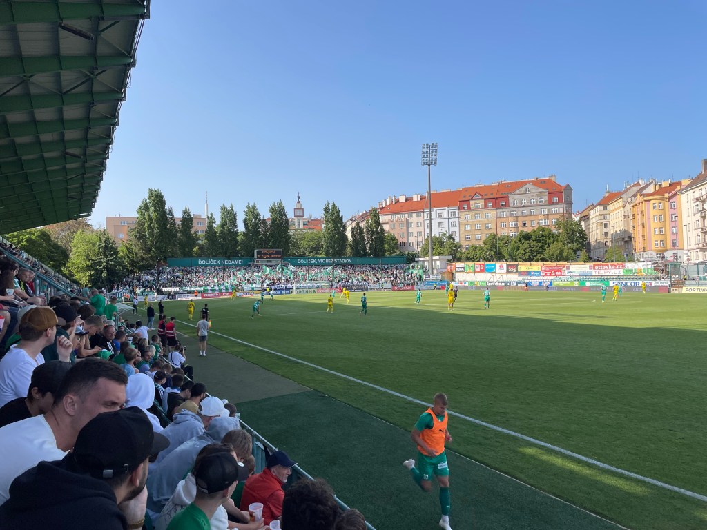 Einige Tage Böhmische Schweiz und im Anschluss noch ein Aufenthalt im sowohl total wunderhübschen, als auch leider vom Overtourism und sächsischen Junggesellenabschieden gekennzeichneten Prag. Prag? Da darf ein Kick nicht fehlen. Wie es der Fußballgott so will, ist für das Wochenende unseres Aufenthalts in der Moldaumetropole auch der letzte Spieltag der tschechischen Fußballliga angesetzt. Und: Alle drei Prager Erstligisten spielen daheim. Die Qual der Wahl also! Bei Sparta steht eine Meisterfeier an, für Slavia geht es um nichts mehr. Die Bohemians jedoch, die eh der mit großem Abstand sympathischste der genannten Vereine sind, spielen noch um den Einzug in den Europapokal. Das allgegenwärtige Känguru, eine Fanszene, die tendenziell emanzipiert daherkommt bzw. im Gegensatz zu den Lokalrivalen keine Faschoidioten beheimatet, ein netter Ground – klar, dass mein Ausflug mich heute ins Dolicek führt. Während das Drumherum mich flasht und das Krusovice mundet, bleibt der sportliche Teil des Ausflugs trist. Das Spiel gegen die Mannschaft von Sigma Olomouc, die von handgezählten 15 Fans begleitet wird, ist außerordentlich öde. Zwischendurch verfolge ich auf dem Handy die Bundesliga. Während der BVB die Meisterschaft vertändelt, passiert bei den Bohemians…nichts. Torraumsituationen gibt es im Dolicek kaum zu bestaunen, ein Sommerkick im allerschlechtesten Sinne. Da parallel der Nachbar Slavia sein Spiel gegen den FC-Europapokalgegner Slovacko deutlich gestaltet, ist jedoch frühzeitig klar, dass es für die Bohemians an diesem Tag für die erste Euro-Quali seit Ewigkeiten reichen wird. Die Stimmung ist folglich ausgelassen. Dass die Gäste dann wenige Minuten vor dem Ende mit ihrer beinahe einzigen gefährlichen Offensivaktion tatsächlich ein Tor erzielen, ist dabei unerheblich. Mit dem Schlusspfiff erfolgen Platzsturm, Pyro, Party, Pivo & Co. Es wird gefeiert. Das Känguru tanzt. Und nun fühle ich mich tatsächlich bestens unterhalten!