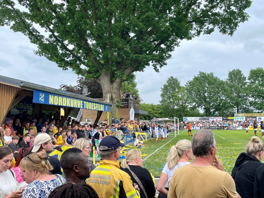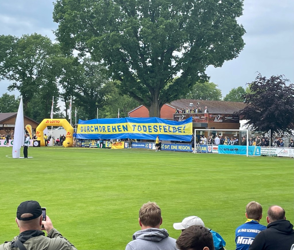 In Schleswig-Holstein wird das Endspiel um den Landespokal in diesem Jahr zum Dorfevent. Todesfelde, ein 1000-Einwohner-Nest im Nirgendwo zwischen dem bei freilebenden Wölfen besonders beliebten Segeberger Forst und dem Erlebniswald Trappenkamp, ziemlich genau auch im Ausbaugebiet der immer mal wieder geplanten A20 gelegen, beheimatet neben einem Barfußpark auch einen mittlerweile wenigstens in Schleswig-Holstein bekannten und hier zuletzt mit dem Gewinn der „Flens-Oberliga“ auch recht erfolgreichen Fußballverein. Von „Jodas“ Gnaden übrigens. JODA – so heißt ein großer Holzhandel aus dem benachbarten Daldorf, dessen Chef glühender „Tofe“-Fan und umtriebiger -Mäzen sein soll: JOrkisch-DAldorf. Entsprechend trägt der mit allerlei Holzgebilden wie z.B. einer kleinen „Nordkurve“, einer nicht eben viel größeren Haupttribüne sowie einem überdachten Tresenbereich aufgemöbelte Dorfsportplatz auch den Namen JODA-Sportpark.