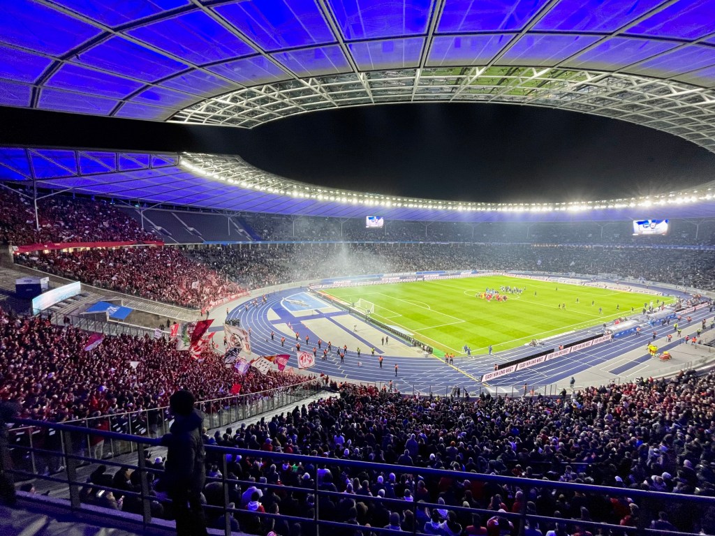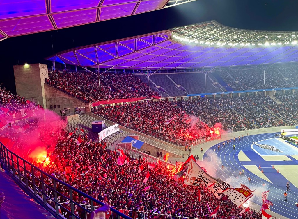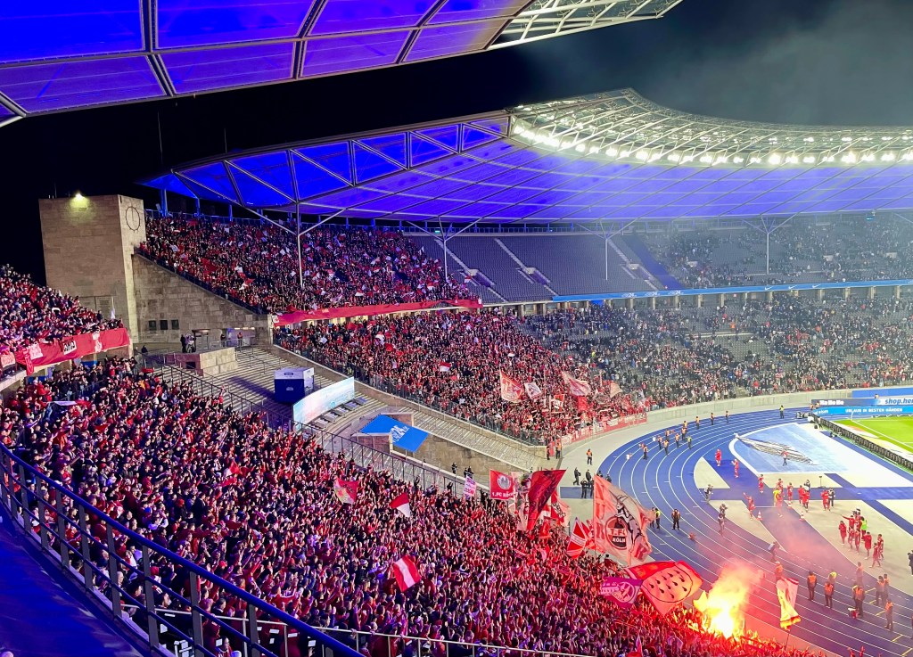 Vor dem Olympiastadion herrscht Chaos. Das Einlassmanagement des einstigen Big City Clubs ist – freundlich formuliert – provinziell. Nachdem diverse Hürden überwunden und diverse Diskussionen mit überforderten Ordnern geführt worden, betreten wir ca. eine Minute nach dem Anpfiff das Stadioninnere. Dort ist alles fein. Ca. 18.000 Kölner geben den Ton an, während das Spiel jedoch eher dahinplätschert. Der FC ist nach dem wilden und im Ergebnis kaum überzeugenden Saisonstart um Ordnung bemüht, Herthas Bemühungen wirken zahnlos und uninspiriert. Mitte der ersten Halbzeit reicht ein einfacher Pass in die Tiefe, um die Verteidigung der alten Dame auszuhebeln. Lemperle trifft zur nicht unverdienten Kölner Führung.