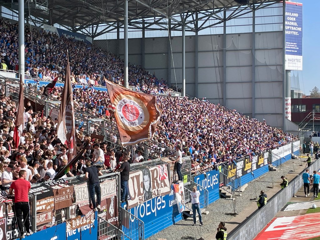 Während rum um den Spielbeginn und auch allgemein die Musikauswahl im Holsteinstadion für ein Bundesligastadion einmal mehr recht erträglich ist, ist der ewig stillos-nervige Jahrmarktschreier am Kieler Stadionmikro kaum auszuhalten. Egal, mit Spielbeginn performt dann eh insbesondere der Gästeblock. „Immer mit dabei…“ stimmt in meinem Fall zwar nicht, ist aber der Gassenhauer des Tages.