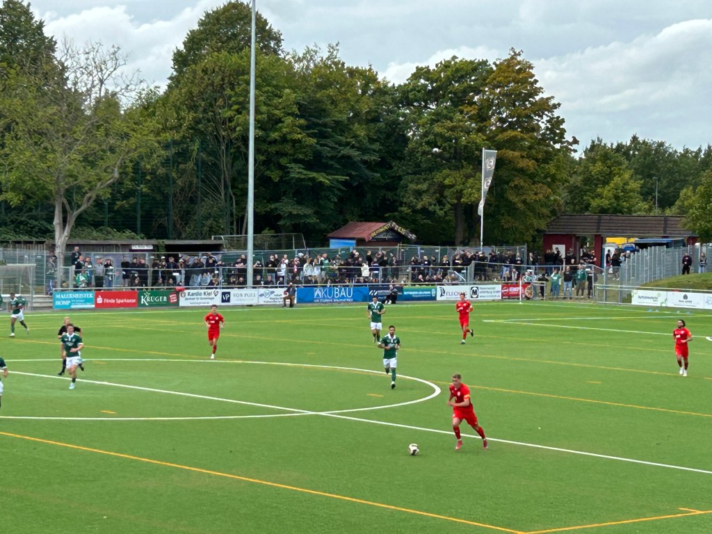 Das Spiel als solches ist schnell erzählt. Vor den knapp 600 Zuschauern entwickelt sich ein offenes Spiel, in dem ein Klassenunterschied nicht zu erkennen ist. Obwohl Kilia alles andere als gut in die Oberligasaison gestartet ist, agiert das Team gegen den VfB mindestens auf Augenhöhe. Dass die Lübecker mit einer 1:0 Führung in die Pause gehen, ist ihrer Effektivität geschuldet. Aus nur zwei vernünftigen Angriffen entsteht ein Tor. Nach dem Wechsel plätschert das Spiel dahin. Nach dem Lübecker 2:0 hält Kilia aber fortgesetzt dagegen, generiert 1,2 richtig gute Chancen und kann folgerichtig den Anschlusstreffer erzielen. Die Entscheidung fällt dann knapp 10 Minuten vor dem Ende nach einer feinen Einzelleistung des Lübecker Kapitäns.