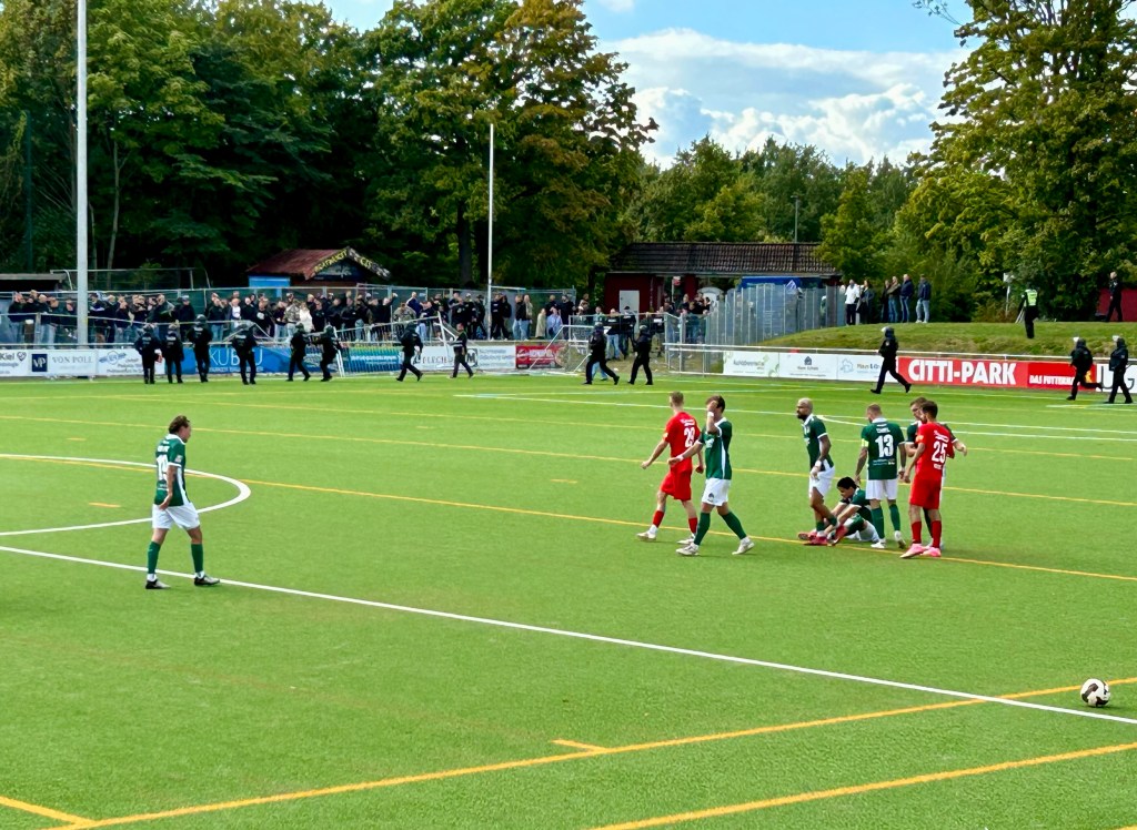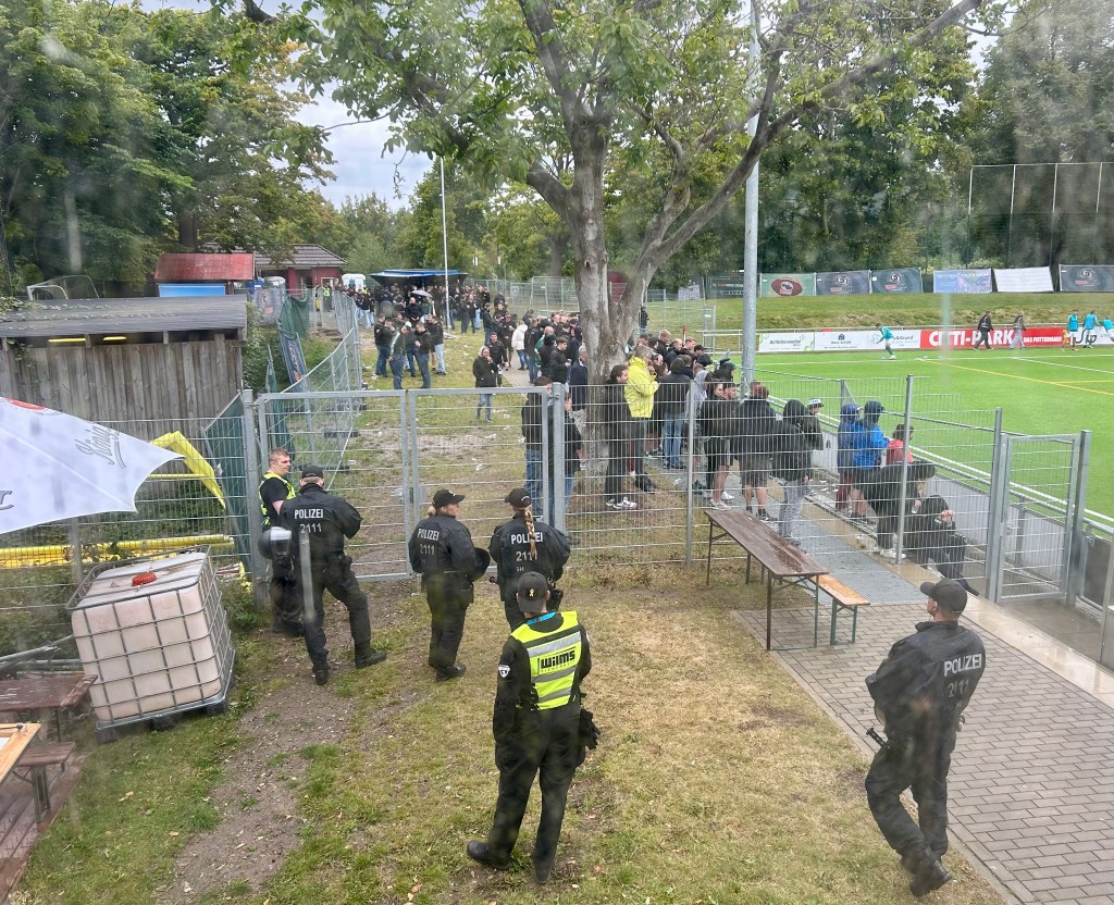 Ein vermeintlich umfassendes und ausgeklügeltes Sicherheitskonzept mit einem durch Bauzäune abgesicherten Mini-Gästeblock mit lediglich 200 Stehplätzen und einer Beschränkung des Kartenverkaufs auf den Presale direkt am Sportplatz lässt das erhoffte Fußballhighlight schließlich für alle Beteiligten, aber insbesondere für den gastgebenden FC Kilia eher zu einem Ärgernis werden. Zudem sind die genannten Maßnahmen total überflüssig. Dass Holstein Kiel und der HSV parallel in anderen Regionen Deutschlands agieren, ist die beste Prophylaxe gegen die befürchtete Fußballrandale. Klar, ein paar Assis sind wie immer am Start, wenn der VfB spielt. Diese finden in den benannten Bauzäunen heute aber ihren Hauptgegner, der sich wie zu erwarten als wenig standfest erweist und bei entsprechender Kraftanstrengung innerhalb weniger Sekunden darniederliegt – wie sich bei den Lübecker Torerfolgen und unmittelbar nach Abpfiff zeigt. Darüber hinaus passiert natürlich… nix.