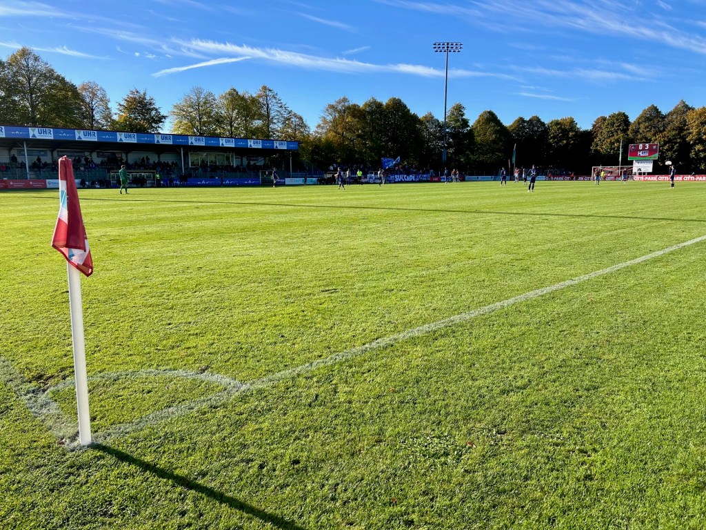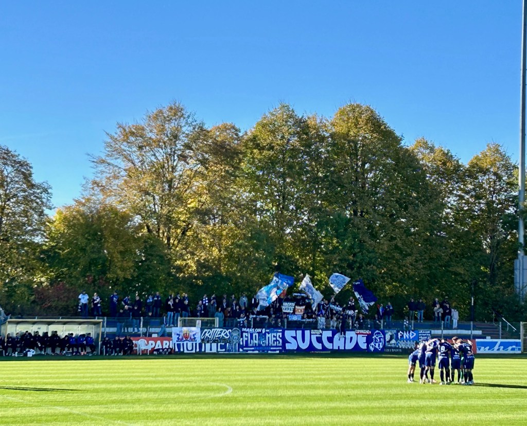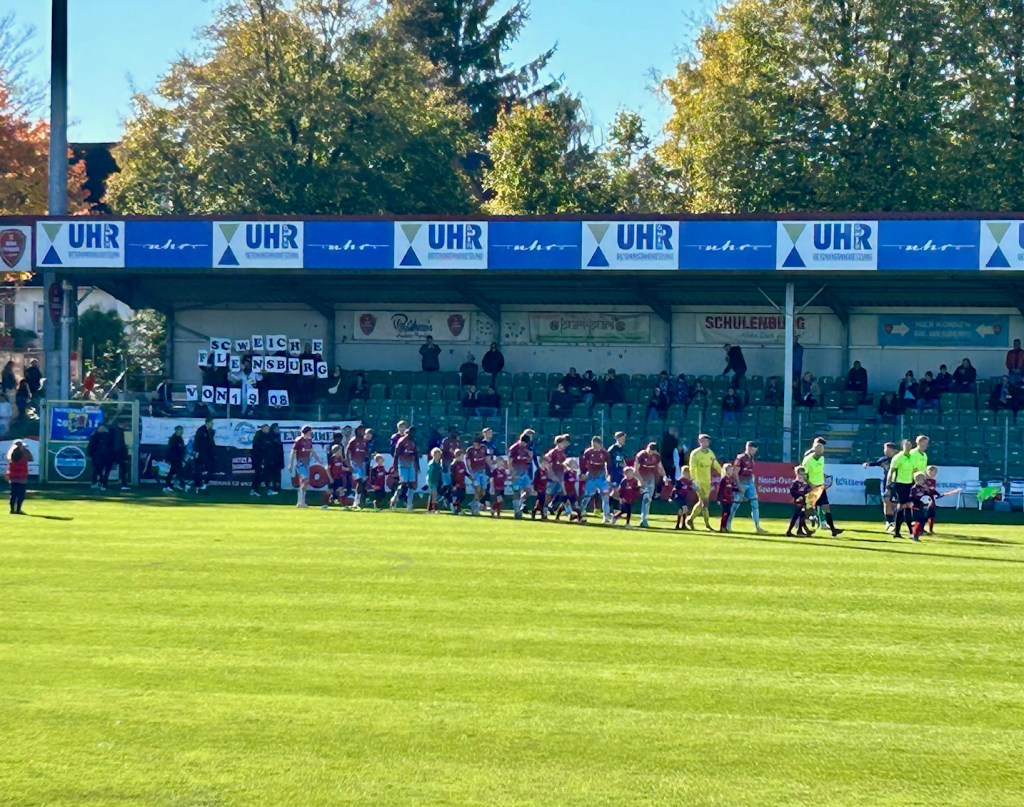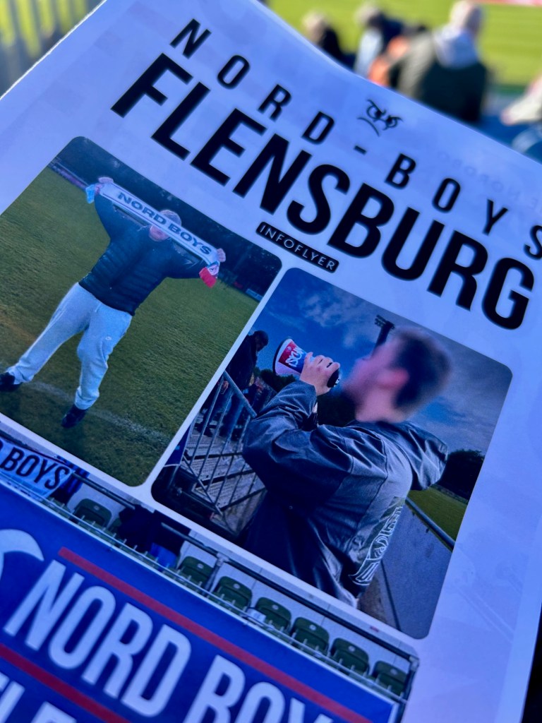 Bei allerbestem Herbstwetter mache ich mich dann tatsächlich auf in die nördlichste Stadt der Republik. Der SC Weiche Flensburg 08, ein Hybrid aus dem Eisbahnerverein des flensigen Vororts Weiche und dem Traditionsverein Flensburg 08, ist etablierter Nordregionaligist und wurde von mir bisher weitgehend ignoriert. Heute ist mit dem VfB Oldenburg der Tabellenführer zu Gast. Mit ihm sind ein paar hundert Gästefans am Start – dank einer Fanfreundschaft der Ultragruppierungen dabei auch ein paar Kieler… Im Heimbereich hingegen versuchen sich ca. 20 Küstenlümmel und ebenso viele Jung-Ultras, die in einem ausliegenden Infoflyer informieren, dass sich solche eben nicht seien und sich Nord-Boys nennen. Das Spiel wird von Beginn an von den Gästen bestimmt. Die Überlegenheit lässt sich bald auch am Zwischenstand ablesen. Mit einer 3:0-Führung gehen die Oldenburger in die Schlussphase des Spiels, die dann überraschend noch ein wenig Spannung bereithält, da die Flensburger nach einem Elfergeschenk direkt nach Eckball nachlegen können. Die letzten fünf Minuten werden aus VfB-Sicht dann doch arg wacklig.