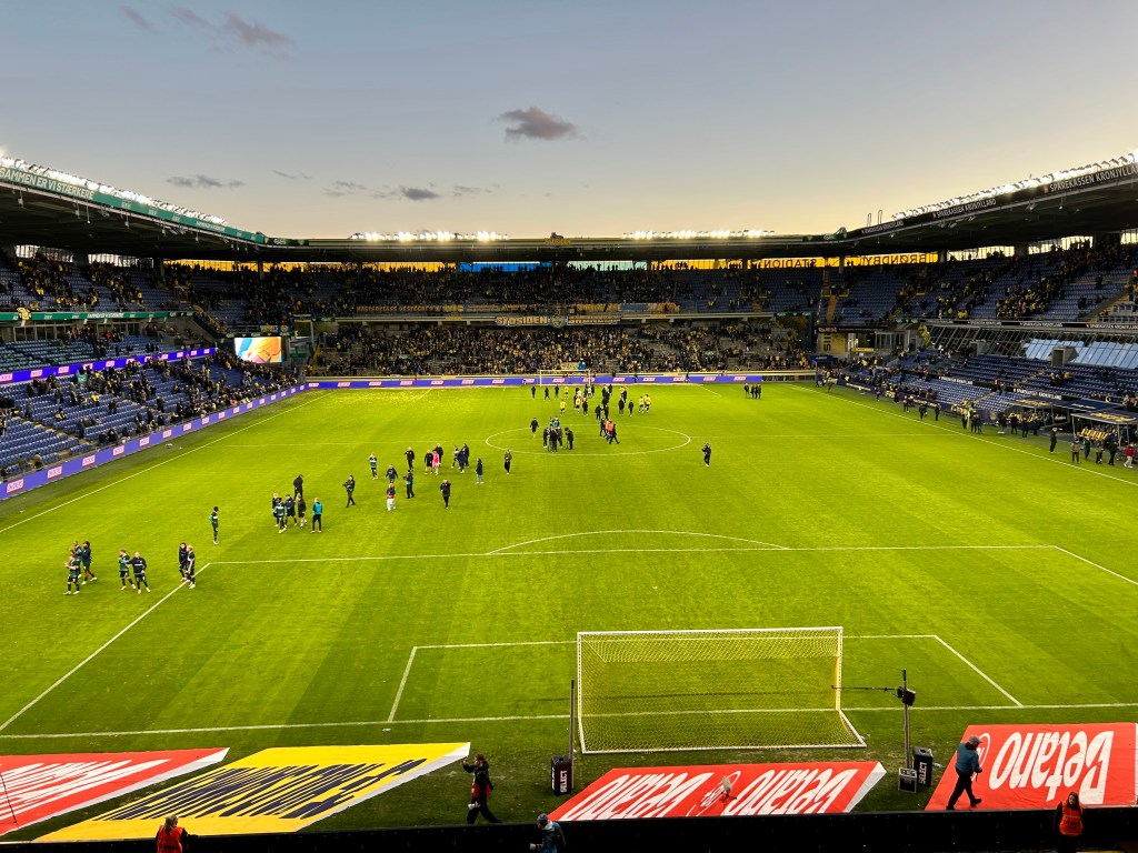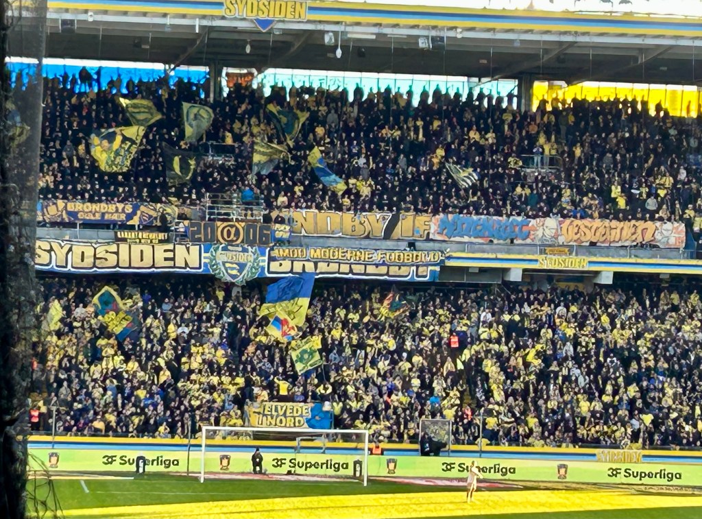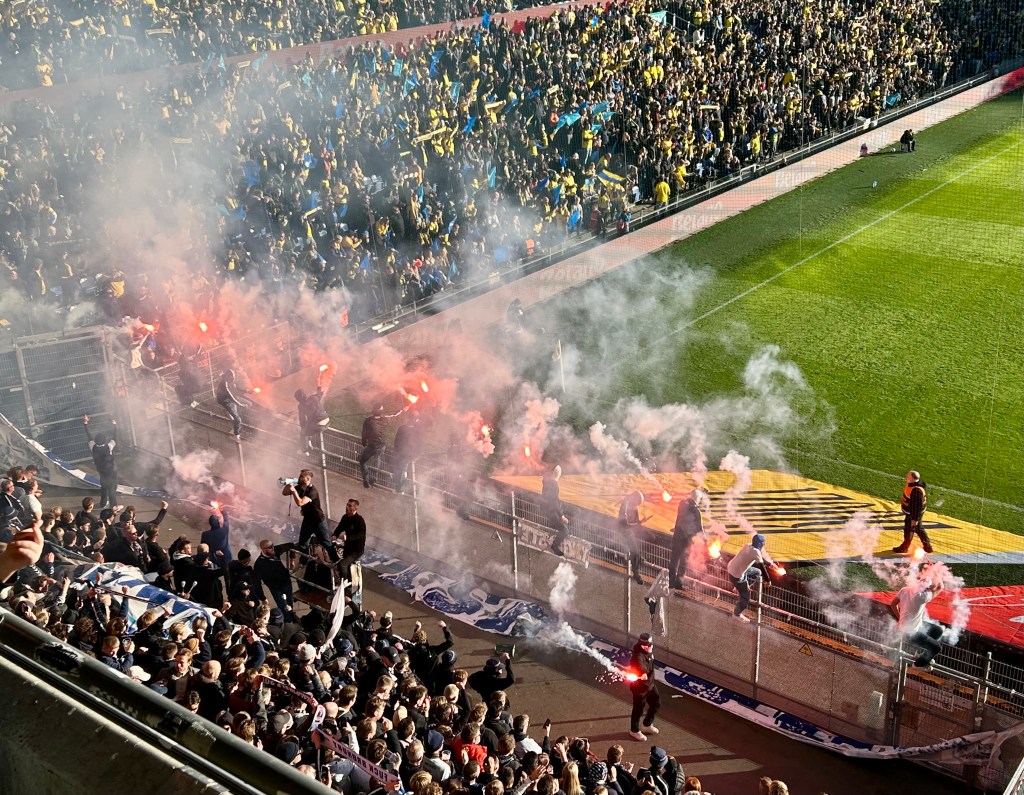 In Kopenhagen angekommen checke ich dann ein in einem dieser seelenlosen Budget-Hotels, von denen es in der Stadt sehr, sehr viele gibt. Überhaupt – das merke ich dann im Rahmen meiner Stadterkundungen der kommenden beiden Tage – ist der Tourismus seit meinem letzten Besuch noch einmal richtig explodiert. Was immer noch angesagt ist in der Stadt: Fahrradfahren! Ich buche mir einen 24-Stunden-Pass und reite auf meinem Esel „Janine“ durch die Metropole. Nach einem Abstecher über Christianshavn nach Christiania sowie entlang des Nyhavns und Amalienborg gen Kastell und Meerjungfrau finde ich mich im staatlichen Kunstmuseum wieder. Nach Munch und Nolde gibts Mittag und dann einen wilden Ritt in die Peripherie. Nach Brøndby! Zum eindeutig sympathischeren der beiden großen Hauptstadtklubs. BIF lädt heute zum Heimspiel gegen den aktuellen Tabellenführer aus Aarhus. Und für die generell ja eher hyggelige dänische Superliga ist Brøndby IF schon speziell – ohne Frage. Support, Fanaufkommen, Drumherum… BIF und auch der FC Kopenhagen spielen in einer eigenen Liga. Am ehesten mithalten können da die Fanszenen der verhältnismäßig großen Traditionsvereine wie z.B. aus Aarhus. So ist der Gästeblock heute auch gut gefüllt und stimmungsvoll, was ich insbesondere deshalb gut mitbekomme, weil ich direkt oberhalb von diesem sitze. Gut wahrnehmbar sind deshalb auch die Vorbereitungshandlungen zum Einsatz von Pyrotechnik beim Einlauf der Mannschaften…