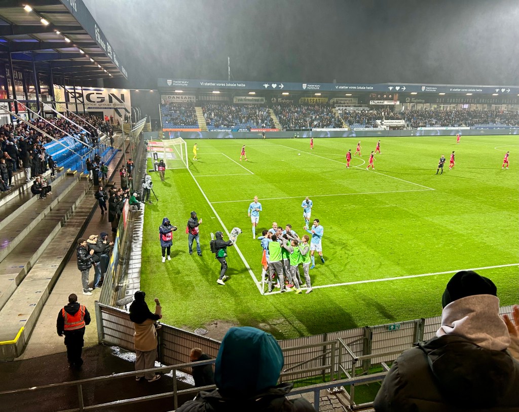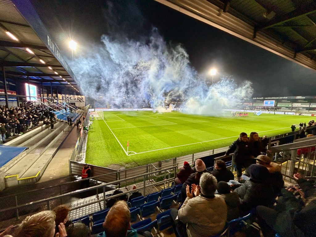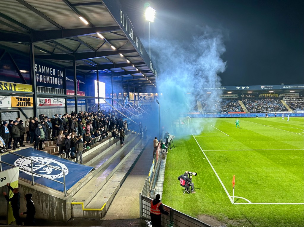Mit dem ersten Nachmittagszug geht es dann zurück nach Kolding. Das Wetter hat mittlerweile umgeschlagen, sodass ich auf den Strandausflug verzichte. Stattdessen stoppe ich in Christiansfeld und Christinero, um dann im Anschluss noch ein wenig Fußball in Haderslev zu schauen. Das Montagsspiel zwischen Sønderjyske und den Aufsteiger aus Fredericia wartet. Mit knapp 5000 Zuschauern dann wieder ein wenig Superliga-typischer… Das Überraschendste an diesem verregneten Abend mit einem lockeren Start-Ziel-Sieg der Heimmannschaft ist die Pyrotechnik, die der Heimverein ganz offiziell vorm Anpfiff zündet. Da können auch die Haderslever Ultras nicht mithalten…