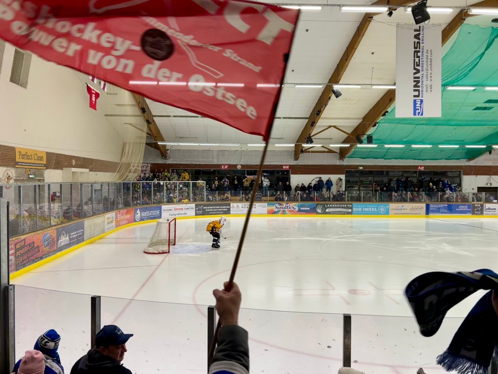 Zwei kleine Fanblöcke – die Timmendorfer Strandkurve genauso wie der Gästebereich – supporten ihre Teams bereits mit Verve, während die Maskottchen das Spiel mit einem Scheinbully eröffnen. 12 Sekunden nach dem richtigen Bully führen dann bereits die Gäste, zwei Minuten später gleichen die Timmendorfer Beach Devils aus, gehen eine halbe Minute später sogar in Führung. Ein hanebüchener Abwehrfehler bringt die in dieser Saison noch ungeschlagenen Adendorfer wieder ins Spiel. Es steht nach knapp fünf gespielten Minuten also 2:2. Was für ein rasanter Start war das denn? Großartig! Da verzeiht man den Teams gerne, dass es gegen Ende des ersten Drittels ein wenig ruhiger wird. Das zweite Drittel verfolge ich dann aus dem Timmendorfer Fanblock. Auch diese Spielsequenz beginnt brutal intensiv. Bereits nach etwa 20 Sekunden führen erneut die Beach Devils. Doch auf dieses Tor haben die Adendorfer eine rasche Antwort: 3:3.